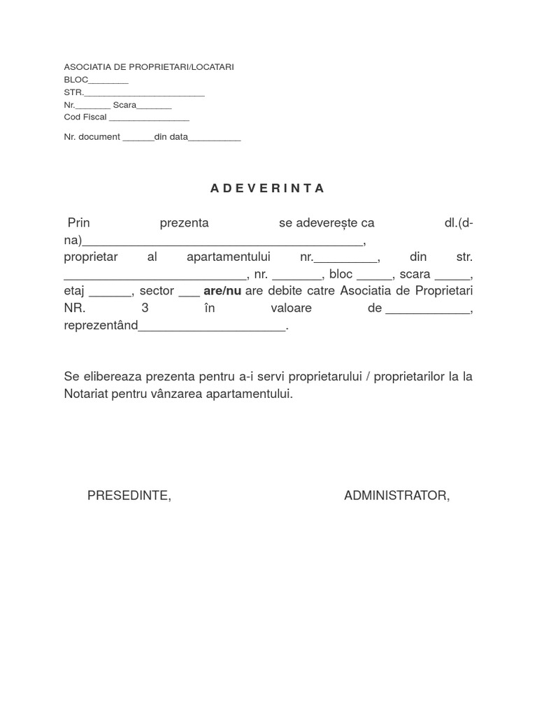Model Adeverinta Asociatia De Proprietari