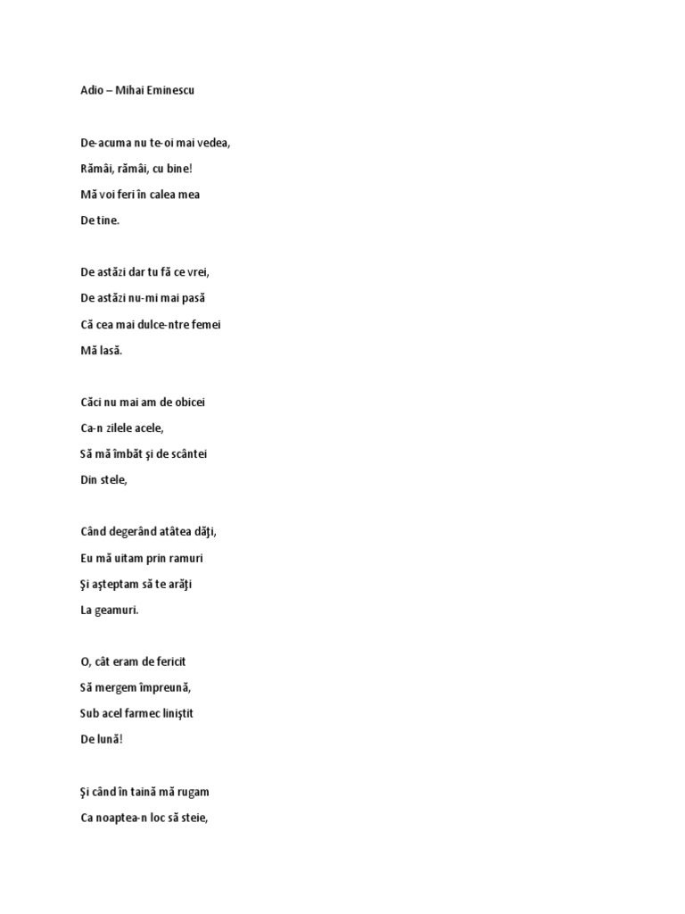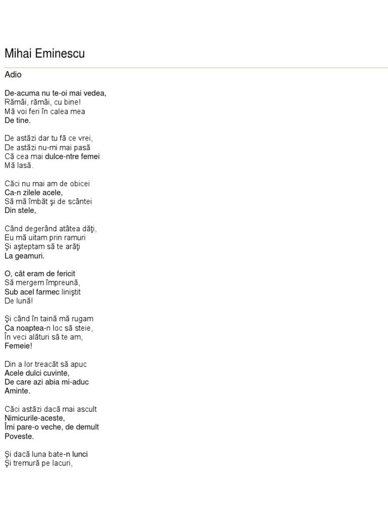 Poezie Romanească Adio De Mihai Eminescu De Acuma Nu Te Oi Mai Vedea Rămai Rămai Cu Bine Mă Voi Feri In Calea Mea De Tine De Astăzi Dar Tu Fă Ce Vrei De