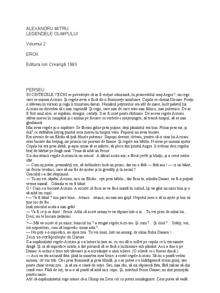 în 1972 cartea a primit premiul ion creangă din partea academiei r s. Legendele olimpului astazi omul cunoaste fortele naturii si puterea lor nu il mai inspaimanta. Legendele olimpului legendele olimpului este o lucrare in doua parti intitulate reprezentativ zeii si eroii apartinand lui alexandru mitru in care sunt narate faptele legendare ale unor personaje mitologice din vechea grecie. Rezumat lung pe capitole la volumul 2 al cărții legendele olimpului scrisă de scriitorul român alexandru mitru.