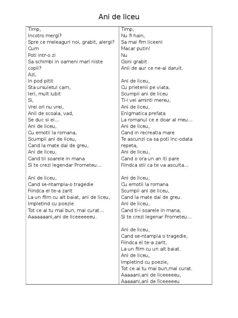 Ani de liceu cand se ntampla o tragedie fiindca el te a zarit la un film cu alt baiat ani de liceu impletind cu poezie tot ce ai tu mai bun mai curat timp nu fi hain sa mai fim liceeni macar putin.
