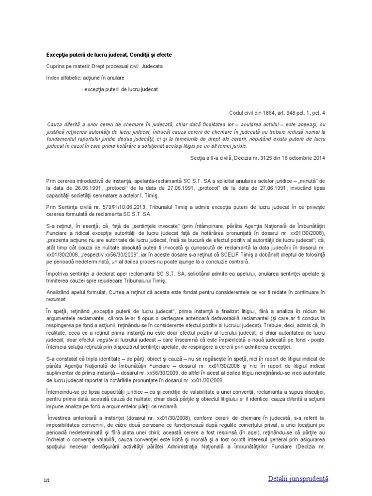 Iccj 2014 Excepţia Puterii De Lucru Judecat Condiţii Si Efecte