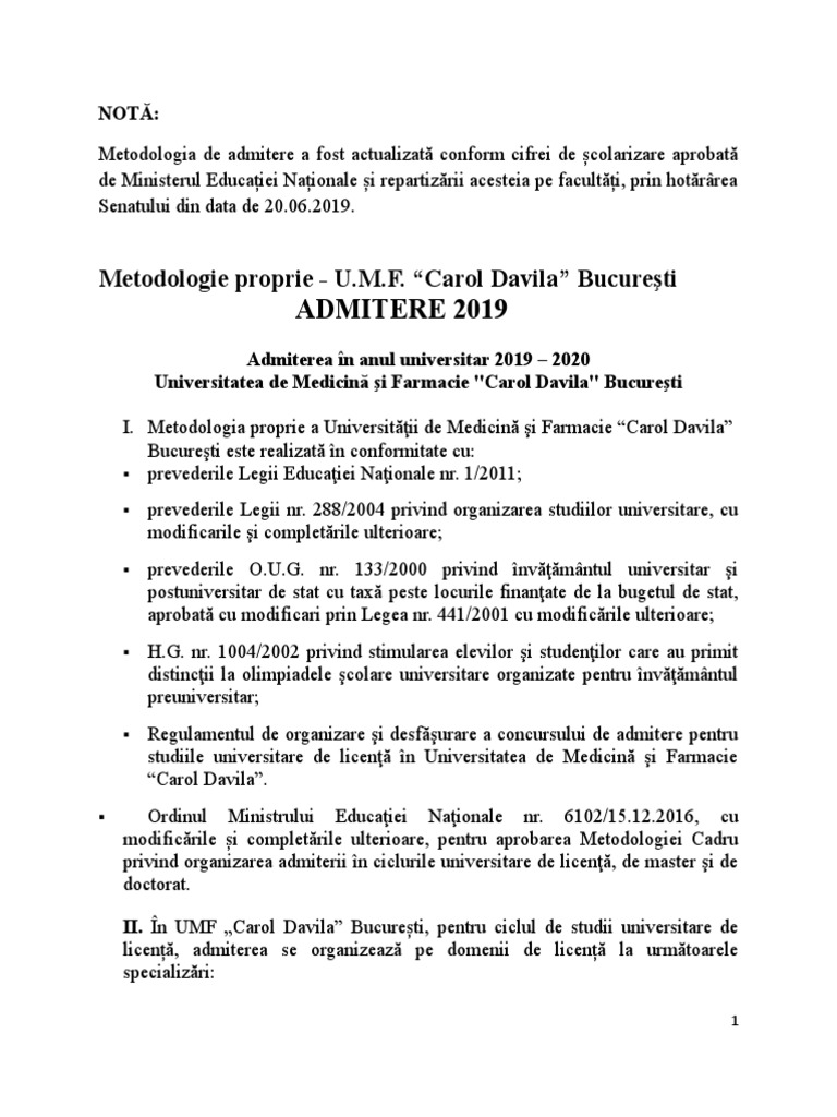 Admitere 2019 Metodologie Proprie U M F Carol Davila Bucuresti
